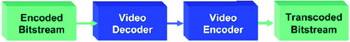 視頻轉(zhuǎn)碼是一個高運算負(fù)荷的過程,需要對輸入的視頻流進行全解碼、視頻過濾/圖像處理、并且對輸出格式進行全編碼。最簡單的轉(zhuǎn)碼過程(圖3)僅僅涉及到解碼一個比特流和用不同的編解碼器重新編碼兩個步驟。這種硬轉(zhuǎn)碼看似很簡單,只需要一個解碼器和一個編碼器,但是最終顯示結(jié)果并不理想,因為視頻數(shù)據(jù)解碼后重新編碼會降低畫質(zhì)。