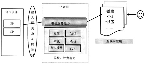 電信各種業(yè)務(wù)能力經(jīng)過封裝后以Web Services的方式向外開放,由互聯(lián)網(wǎng)應(yīng)用調(diào)用這些服務(wù)能力,提供基于互聯(lián)網(wǎng)的新型話音型業(yè)務(wù),互聯(lián)網(wǎng)應(yīng)用提供商作為SP與電信運(yùn)營(yíng)商進(jìn)行收入分成,同時(shí)又有大量的CP作為新型話音應(yīng)用的內(nèi)容提供商加入價(jià)值鏈,運(yùn)營(yíng)商在價(jià)值鏈上充當(dāng)主導(dǎo)作用。