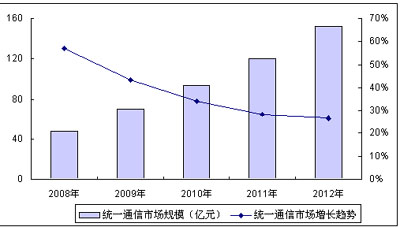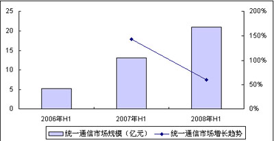統(tǒng)一通信作為一種以融合技術(shù)為基本特征的特定解決方案和應(yīng)用,通過對各種溝通方式進(jìn)行有效的融合,滿足用戶方便快捷的信息獲取和溝通需求,近年來在全球范圍內(nèi)得到了迅猛發(fā)展,各大通信與信息技術(shù)相關(guān)廠商紛紛加入統(tǒng)一通信市場的競爭中。賽迪顧問數(shù)據(jù)統(tǒng)計顯示,2008年上半年,中國統(tǒng)一通信整體市場規(guī)模已達(dá)到21.01億元,同比增長超過60.9%,繼續(xù)保持強(qiáng)勁的增長勢頭。
