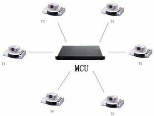 在會(huì)議場點(diǎn)數(shù)目不多且地域分布比較集中時(shí),可采用單MCU方式,其組網(wǎng)結(jié)構(gòu)見圖所示。圖中T1-T6均為視頻會(huì)議終端系統(tǒng)設(shè)備。
