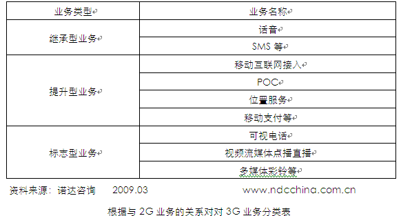 根據(jù)用戶對(duì)3G業(yè)務(wù)的體驗(yàn),其與2G業(yè)務(wù)的關(guān)系可以分為:繼承型業(yè)務(wù)(話音、SMS等)、提升型業(yè)務(wù)(移動(dòng)互聯(lián)網(wǎng)接入、POC、位置服務(wù)、移動(dòng)支付、整首歌曲下載等)、標(biāo)志型業(yè)務(wù)(可視電話、視頻流媒體點(diǎn)播直播、多媒體彩鈴、視頻會(huì)議等)