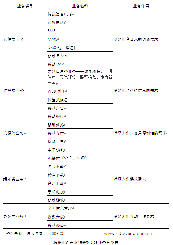 從個(gè)體用戶橫向需求角度對(duì)業(yè)務(wù)進(jìn)行劃分,3G業(yè)務(wù)可以分為五大類(lèi),主要包括五類(lèi)通訊類(lèi)業(yè)務(wù)、信息類(lèi)業(yè)務(wù)、交易類(lèi)業(yè)務(wù)、娛樂(lè)類(lèi)業(yè)務(wù)、辦公類(lèi)業(yè)務(wù)。諾達(dá)咨詢《3G發(fā)展報(bào)告系列——全球3G業(yè)務(wù)與運(yùn)營(yíng)市場(chǎng)發(fā)展研究報(bào)告2009》認(rèn)為該種一方面考慮了企業(yè)業(yè)務(wù)發(fā)展相近性和規(guī)模效應(yīng),另一方面考慮的用戶的不同需求特性,把一個(gè)用戶多種需求分割開(kāi)來(lái),以實(shí)現(xiàn)低成本的使需求得以滿足。是一種傳統(tǒng)的業(yè)務(wù)分類(lèi)方法,適合傳統(tǒng)技術(shù)條件下的合作分工的市場(chǎng)及產(chǎn)業(yè)環(huán)境。這種分類(lèi)方法利于業(yè)務(wù)的設(shè)計(jì)及推出。
