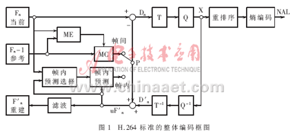 Abstraction Layer),負(fù)責(zé)對數(shù)據(jù)進(jìn)行打包和傳送。H.264編碼圖像通常分為三種類型:I幀、P幀、B幀。I幀為幀內(nèi)編碼幀,其編碼不依賴于已編碼的圖像數(shù)據(jù)。P幀為前向預(yù)測幀,B幀為雙向預(yù)測幀,編碼時(shí)都需要根據(jù)參考幀進(jìn)行運(yùn)動(dòng)估計(jì)。同時(shí),H.264在提高圖像傳輸容錯(cuò)性方面做了大量工作,重新定義了適于圖像的結(jié)構(gòu)劃分。在編碼時(shí),圖像幀各部分被劃分到多個(gè)Slice結(jié)構(gòu)中,每個(gè)Slice都可以被獨(dú)立編碼,不受其他部分影響。Slice由圖像最基本的結(jié)構(gòu)——宏塊組成,每個(gè)宏塊包含一個(gè)16×16的亮度塊和兩個(gè)8×8的色度塊。H.264標(biāo)準(zhǔn)的整體編碼框圖如圖1所示。編碼過程中,原始數(shù)據(jù)進(jìn)入編碼器后,當(dāng)采用幀內(nèi)編碼時(shí),首先選擇相應(yīng)的幀內(nèi)預(yù)測模式進(jìn)行幀內(nèi)預(yù)測,隨后對實(shí)際值和預(yù)測值之間的差值進(jìn)行變換、量化和嫡編碼,同時(shí)編碼后的碼流經(jīng)過反量化和反變換之后重構(gòu)預(yù)測殘差圖像,再與預(yù)測值相加得出重構(gòu)幀,得出的結(jié)果經(jīng)過去塊濾波器平滑后送入幀存儲(chǔ)器。采用幀間編碼時(shí),輸入的圖像塊首先在參考幀中進(jìn)行運(yùn)動(dòng)估計(jì),得到運(yùn)動(dòng)矢量。運(yùn)動(dòng)估計(jì)后的殘差圖像經(jīng)整數(shù)變換、量化和嫡編碼后與運(yùn)動(dòng)矢量一起送入信道傳輸。同時(shí)另一路碼流以相同的方式重構(gòu)后,經(jīng)去塊濾波后送入幀存儲(chǔ)器作為下一幀編碼的參考圖像。
