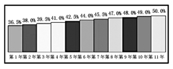 除了分檔包月的語(yǔ)音套餐,KDDI還根據(jù)消費(fèi)者的不同需求提供了多樣折扣優(yōu)惠,其中包括在網(wǎng)時(shí)長(zhǎng)優(yōu)惠、家庭優(yōu)惠、個(gè)人優(yōu)惠、學(xué)生優(yōu)惠等多種方式(圖1)。多樣優(yōu)惠折扣方式之間也可以通過(guò)組合產(chǎn)生新的優(yōu)惠折扣內(nèi)容。例如:在網(wǎng)時(shí)長(zhǎng)優(yōu)惠與家庭優(yōu)惠共享的套餐在入網(wǎng)的第1年優(yōu)惠折扣達(dá)到40%,此后每續(xù)約1年將增加1%的折扣優(yōu)惠,逐年累積下來(lái),在第11年將享受高達(dá)50%的優(yōu)惠折扣(圖2)。時(shí)段優(yōu)惠套餐中體現(xiàn)分時(shí)段優(yōu)惠,區(qū)分忙時(shí)、閑時(shí),周末時(shí)間和工作時(shí)間,分別定價(jià)。例如,同樣是9500日元的套餐檔次,在時(shí)段優(yōu)惠套餐中,周末白天(閑時(shí))的資費(fèi)是每分鐘10日元,而在非時(shí)段優(yōu)惠的普通套餐中,每分鐘的資費(fèi)是24日元,可見(jiàn)在網(wǎng)絡(luò)閑時(shí)可以享受更多的資費(fèi)優(yōu)惠。而針對(duì)學(xué)生和老人設(shè)計(jì)的套餐也能享受比普通套餐更優(yōu)惠的資費(fèi),這就體現(xiàn)了區(qū)別細(xì)分市場(chǎng)的差異化定價(jià)。
