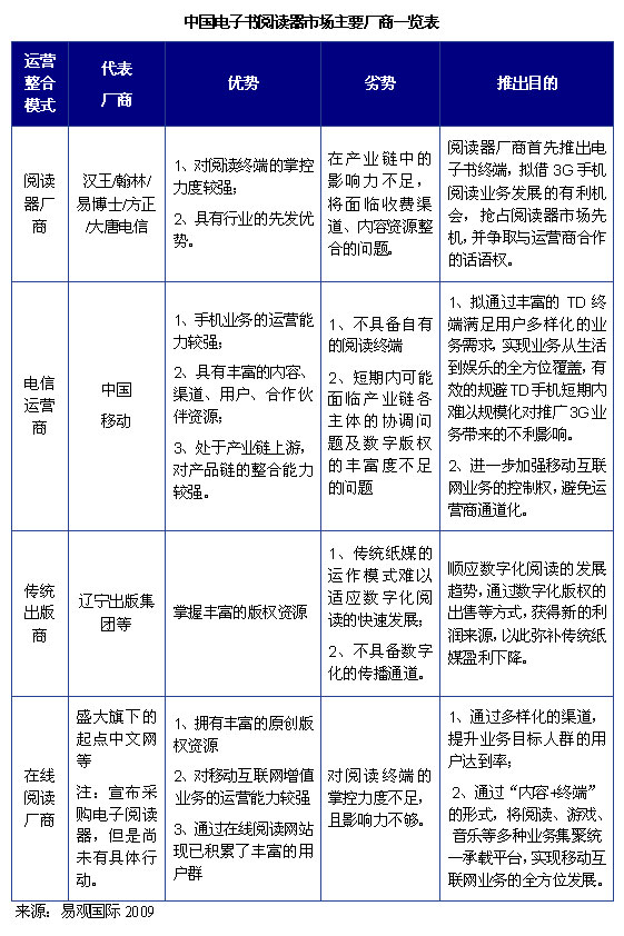 International)分析認(rèn)為,目前中國(guó)電子書市場(chǎng)以閱讀器廠商及電信運(yùn)營(yíng)商兩種力量為主導(dǎo),此外還包括傳統(tǒng)出版商、在線閱讀廠商等其他力量。對(duì)現(xiàn)有各種運(yùn)營(yíng)模式的企業(yè)分析如下: