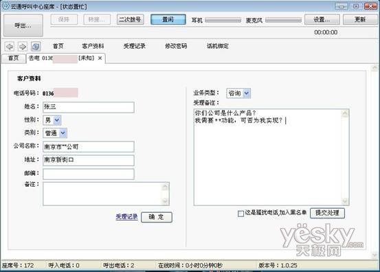 除此之外,當使用座席軟件呼出時,若該號碼之前撥打過并留下過相關客戶信息,彈屏內容會顯示其詳細的個人信息,并提供歷史受理記錄的查詢接口,起到輔助營銷人員的受理工作的作用,試問,如果再次撥打電話時就能詳細說出用戶的姓名以及當時所提的需要,他是否會覺得很親切?(如下圖)如果該號碼未有客戶資料的記錄時,彈屏會直接為客服提供客戶詳情填寫頁面,便于營銷人員很方便的就可以建立該客戶的個人檔案,提高受理效率。