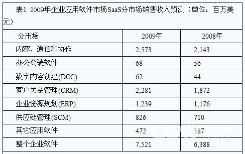 在Gartner的統(tǒng)計(jì)中,SaaS領(lǐng)域中,除了CRM之外,內(nèi)容、通訊和協(xié)作市場(chǎng)同樣表現(xiàn)不俗,在2009年,這一市場(chǎng)的銷售收入將從2008年的21.4億美元增長到26億美元,甚至超過了CRM分市場(chǎng)的23億美元。其他如ERP分市場(chǎng)等同樣占據(jù)不小的份額。