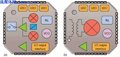 圖1:ADI的ADRF670x是一個(gè)帶PLL和VCO的發(fā)送調(diào)制器(a)。ADRF660x混頻下變頻器包括一個(gè)用于單端50Ω輸入的射頻輸入不平衡變壓器和一個(gè)帶VCO的PLL合成器(b)。這兩個(gè)器件都適用于LTE和WiMAX基站設(shè)計(jì)。