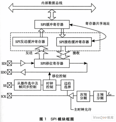 dsPIC30F6014提供了2個(gè)SPI接口模塊,每個(gè)接口模塊包括三個(gè)特殊功能寄存器和四個(gè)引腳。SPIxBUF是數(shù)據(jù)緩沖寄存器。需要注意的是,接收緩沖SPIxRBF和發(fā)送緩沖SPIxTBF共享同一個(gè)地址,即它們都是地址映射到SPIxBUF的。也就是說,當(dāng)對(duì)接收或發(fā)送緩沖寄存器操作時(shí),都只能對(duì)SPIxBUF進(jìn)行操作,而不能直接對(duì)SPIxRBF或SPIxTBF進(jìn)行操作。SPIxCON是控制寄存器,用來對(duì)sPI模塊的操作模式等進(jìn)行配置;SPIxSTAT是狀態(tài)寄存器,用來標(biāo)示SPI模塊所處的狀態(tài)。其模塊框圖如圖1所示。