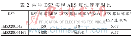 參考文獻(xiàn)[5]在TMS320C54x DSP上實現(xiàn)了AES算法,表2給出兩種實現(xiàn)方式的對比。