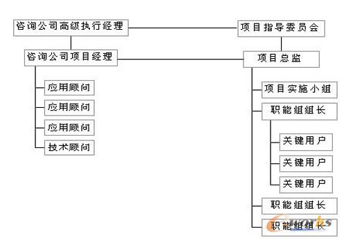 整個組織結構分三層,咨詢公司可以在每一層都安排相應人員予以支持。最高層為項目指導委員會,具有高度決策權。一般由總經(jīng)理主持,企業(yè)有關高層經(jīng)理和項目總監(jiān)作為成員。