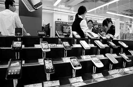 消費(fèi)者在剛剛開業(yè)的福州樂購(gòu)家電區(qū)選購(gòu)手機(jī),智能手機(jī)系統(tǒng)和軟件的發(fā)展,正在成為移動(dòng)互聯(lián)網(wǎng)發(fā)展的“助推器”