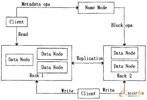 在云端,本系統(tǒng)采用開源框架Hadoop 0.20.2來實(shí)現(xiàn)。該框架主要提供Hadoop分布式文件系統(tǒng)(HDFS)和Map Reduce。其中HDFS為分布式計(jì)算存儲(chǔ)提供了底層支持,圖2是HDFS的結(jié)構(gòu)示意圖: