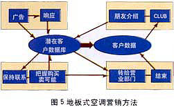 ——銷(xiāo)售支持:東京煤氣公司擁有三種主要的家用產(chǎn)品:地板式空調(diào),煤氣暖氣及煤氣衣服干燥機(jī)。此公司于1993年開(kāi)始運(yùn)用數(shù)據(jù)庫(kù)營(yíng)銷(xiāo),現(xiàn)已取得了驕人的成果。其中主力產(chǎn)品——地板式空調(diào),盡管周期長(zhǎng)、價(jià)格高,1997年一年就銷(xiāo)售了3萬(wàn)6千套,同時(shí)從對(duì)這些用戶(hù)調(diào)查的結(jié)果發(fā)現(xiàn)“滿(mǎn)意”的占96%。下面介紹一下“地板式空調(diào)”的營(yíng)銷(xiāo)方法(見(jiàn)圖5)