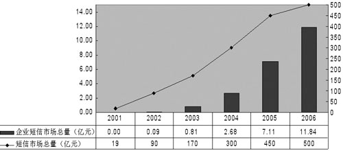 有數(shù)據(jù)顯示,2002年企業(yè)短信市場(chǎng)總量為0.09億元,2003年增長(zhǎng)到0.81億元,預(yù)計(jì)2006年將突破10億元。終于,中國(guó)移動(dòng)和中國(guó)聯(lián)通先后推出了面向企業(yè)用戶(hù)的“集團(tuán)短信”業(yè)務(wù),運(yùn)營(yíng)商對(duì)這個(gè)市場(chǎng)的重視使得一個(gè)新的產(chǎn)業(yè)鏈逐步完善起來(lái),短信也開(kāi)始“潤(rùn)物細(xì)無(wú)聲”地改變著國(guó)內(nèi)企業(yè)的一些習(xí)慣。