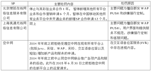 一方面是信息產(chǎn)業(yè)部管理手段的加強,另一方面則是運營商管理方式的嚴(yán)肅,從表格中可以看出,中國移動對SP的懲罰已經(jīng)具有相當(dāng)?shù)牧Χ。在為增殖業(yè)務(wù)打造了相關(guān)的業(yè)務(wù)品牌之后,整個產(chǎn)業(yè)鏈條的控制權(quán)目前還是掌握在運營商手中。