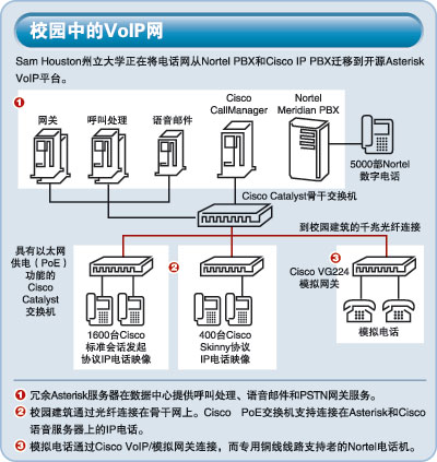 SHSU到目前為止已經(jīng)將1600 部IP電話由Cisco CallManager遷移到Asterisk上,后者運行IETF標準的SIP。Asterisk的功能將分布在幾臺冗余Dell服務(wù)器上:其中兩臺作為冗余PSTN網(wǎng)關(guān);