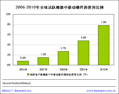 iResearch艾瑞市場(chǎng)咨詢根據(jù)市場(chǎng)咨詢公司RadicatiGroup公布的調(diào)查結(jié)果整理顯示,在2006年全球活躍電子郵箱賬號(hào)中有0.8%使用移動(dòng)電子郵件服務(wù),移動(dòng)電郵將會(huì)逐漸為高端用戶所接受,RadicatiGroup預(yù)計(jì)到2010年活躍電子郵箱賬號(hào)中使用移動(dòng)電郵服務(wù)的比例將達(dá)到7.8%.