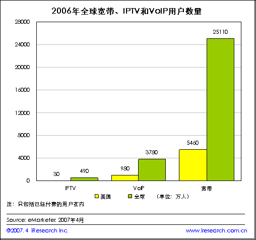 iResearch艾瑞市場(chǎng)咨詢根據(jù)eMarketer最新的數(shù)據(jù)發(fā)現(xiàn),寬帶上網(wǎng)環(huán)境為一些列的寬帶平臺(tái)應(yīng)用產(chǎn)品創(chuàng)造了良好的使用環(huán)境,各種服務(wù)同步發(fā)展起來(lái)。隨著全球?qū)拵в脩魯?shù)量的逐漸增加,全球IPTV和VoIP用戶也迅速成長(zhǎng)。到2006年全球?qū)拵в脩暨_(dá)到2.511億人,VoIP和IPTV的全球用戶數(shù)量也分別達(dá)到了3780萬(wàn)人和490萬(wàn)人。