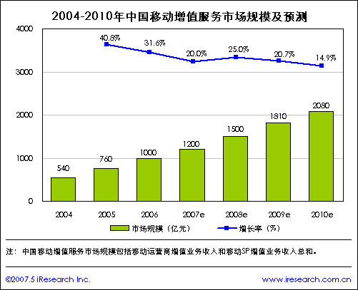 iResearch艾瑞市場咨詢研究成果《2007年移動增值研究報告》顯示,2006年中國移動增值市場規(guī)模達(dá)到了1000億元,比2005年增長31.6%。隨著市場不斷規(guī)范,中國移動增值市場2007年市場規(guī)模增長速度將趨于減緩,預(yù)測2007年中國移動增值市場規(guī)模為1200億元。受2008年奧運(yùn)會的影響,屆時中國移動增值市場又會迎來一個新的發(fā)展高潮,未來三年中國移動增值市場規(guī)模將繼續(xù)增長,預(yù)計(jì)到2010年中國移動增值市場規(guī)模將達(dá)到2080億元。