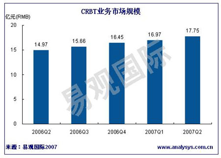 易觀國際研究表明,2007年第2季度中國彩鈴業(yè)務(wù)市場規(guī)模達(dá)到17.75億人民幣,同比增長18.54%。其中對無線音樂平臺(tái)的持續(xù)投入和推廣使中國移動(dòng)彩鈴業(yè)務(wù)穩(wěn)步增長,其彩鈴市場規(guī)模為13.27億人民幣,同比增長19.77%。中國聯(lián)通彩鈴市場規(guī)模為4.48億元,同比上升15.17%。
