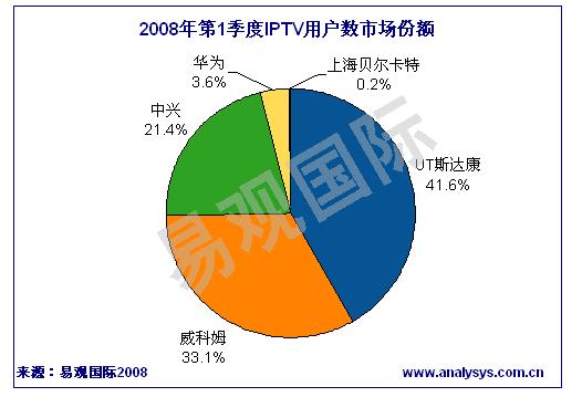 《2008年第1季度中國IPTV市場季度監(jiān)測》數(shù)據(jù)顯示,2008年第1季度中國IPTV累計用戶數(shù)達(dá)131萬人。根據(jù)各廠商中標(biāo)業(yè)務(wù)區(qū)實(shí)際發(fā)展的用戶數(shù)排名,UT斯達(dá)康、威科姆、中興通訊位居前三。2008年第1季度IPTV廠商的競爭格局沒有顯著變化。