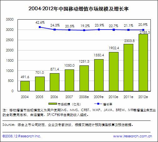 根據(jù)iResearch艾瑞咨詢即將推出的《2008-2009年中國移動互聯(lián)網行業(yè)發(fā)展報告》統(tǒng)計,2008年中國移動增值市場規(guī)模達1251.3億人民幣(約合183.2億美元),相比2007年的1050億人民幣年同比僅增長19.2%,相比2007年增速放緩。(中國移動增值市場規(guī)模定義為用戶為各項移動增值業(yè)務付費總和)
