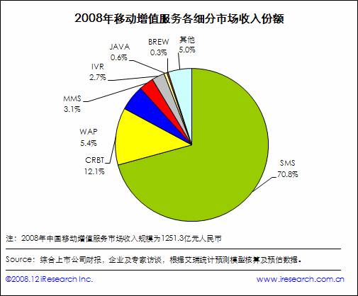 艾瑞研究發(fā)現(xiàn),2008年移動增值服務細分市場收入中SMS以70.8%的比例占據(jù)主導地位,但其他業(yè)務對SMS的分流和替代使其增長率有所下降;CRBT、WAP分別以12.1%和5.4%的比例位居第二、第三。
