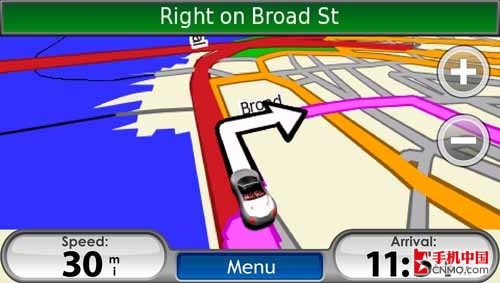 色彩豐富的界面、臨場(chǎng)感十足的導(dǎo)航界面,是Garmin Nuvifon帶給用戶的全新導(dǎo)航體驗(yàn)。用超酷的跑車來(lái)表現(xiàn)目前用戶所處的方位,極具創(chuàng)意之余也更加直觀;用戶也可通過(guò)觸摸虛擬按鍵來(lái)實(shí)現(xiàn)地圖的放大縮小。