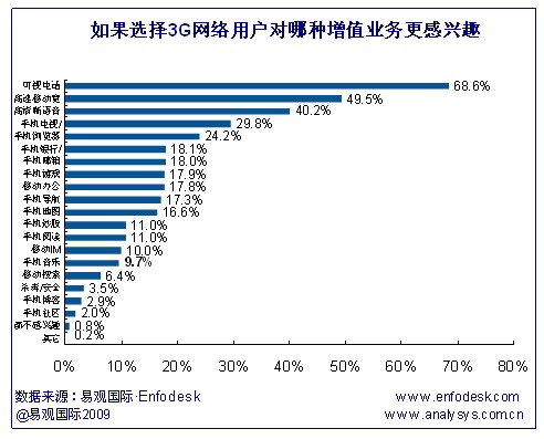 據易觀Enfodesk《中國3G市場用戶調研報告2009》研究發(fā)現,可視電話成為最受用戶歡迎的增值業(yè)務,除此之外,高速移動寬帶業(yè)務和高清晰語音受用戶選擇比例也較高,分別達到49.5%和40.2%。與此相反的是,手機社區(qū)、手機博客和殺毒/安全業(yè)務受歡迎程度最小。