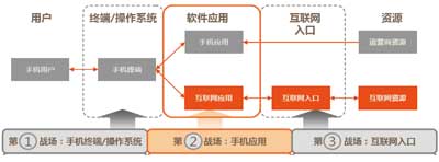 在楊俊看來,應用商店的到來改變了傳統(tǒng)模式。例如,開放的互聯(lián)網(wǎng)模式推倒了原來的花園圍墻,手機軟件類型從單機應用走向在線應用,手機軟件來源從內(nèi)置型轉(zhuǎn)向用戶自主下載、自定制和自安裝。最重要的是,各大廠商不僅滿足于應用商店這一畝三分地,而是把觸角延伸到了產(chǎn)業(yè)鏈上的各個環(huán)節(jié),由此形成了三個主要戰(zhàn)場:手機終端及操作系統(tǒng)、手機應用、互聯(lián)網(wǎng)入口,具體見圖所示。