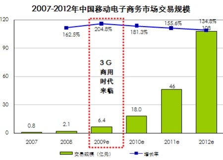 根據(jù)艾瑞咨詢即將發(fā)布的《2008-2009年中國(guó)移動(dòng)電子商務(wù)行業(yè)發(fā)展報(bào)告》數(shù)據(jù)表明,08年中國(guó)移動(dòng)電子商務(wù)市場(chǎng)交易規(guī)模為2.1億元,09年隨著3G商用時(shí)代到來(lái),以及無(wú)線與傳統(tǒng)電子商務(wù)企業(yè)的紛紛試水,預(yù)計(jì)交易規(guī)模將達(dá)6.4億,同比增長(zhǎng)約205%。艾瑞預(yù)計(jì)2012年移動(dòng)電子商務(wù)交易規(guī)模將達(dá)到108億元,發(fā)展?jié)摿薮蟆?br />