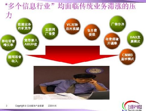第四,廣電也有它面臨的問題,像現(xiàn)在的收視費(fèi)怎么提升,收費(fèi)頻道怎么讓大家接受,CMMB怎樣盈利,廣告被分流等等。