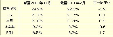 在截至2010年2月的三個(gè)月內(nèi),全美13歲及以上年齡的手機(jī)注冊(cè)用戶為2.34億人,摩托羅拉位居第一,市場(chǎng)份額達(dá)到22.3%,LG排名第二,市場(chǎng)份額為21.7%,其次分別為三星(21.4%)、諾基亞(8.7%)和RIM(8.2%)。