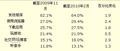以下為各類移動(dòng)內(nèi)容截至2009年11月的三個(gè)月平均使用比例與截至2010年2月的三個(gè)月平均使用比例對(duì)比:
