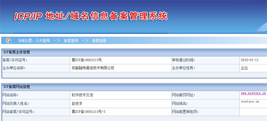 從目前看,WoStore相關(guān)域名可能同樣無法幸免,盡管目前wostore.cn已被用作中國聯(lián)通“WoStore應(yīng)用商店”官網(wǎng)域名,并在版權(quán)區(qū)標(biāo)注為“中國聯(lián)通版權(quán)所有”,但目前域名注冊商處信息仍然顯示,wostore.cn所有者為“成都融特通信技術(shù)有限公司”。工信部備案資料顯示, wostore.cn于今年1月11日通過審核備案,目前網(wǎng)站負(fù)責(zé)人同樣是成都融特通信技術(shù)有限公司。