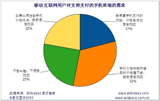 據(jù)Enfodesk易觀智庫最新報告《中國移動互聯(lián)網(wǎng)市場用戶研究報告2010》研究發(fā)現(xiàn),目前在移動互聯(lián)網(wǎng)用戶中,有75%的用戶對具有移動支付功能的手機表現(xiàn)出明顯的興趣,其中影響不大,完全靠性價比決定是否購買的用戶占比最多,約為32%,只有在移動具備支付功能的手機和可接受價格相近時才會購買。另外21%的人由于對移動支付業(yè)務需求程度較高,愿意為此付出更高價格,其他22%的用戶則在比同性能手機價格低些之后,才會進行消費。除此之外,還有25%的用戶對于具備支付功能的手機沒有絲毫興趣,不愿意購買。