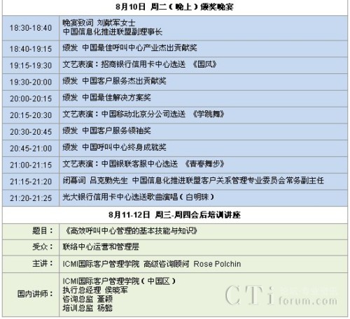 CTI論壇(ctiforum)8月3日消息(記者 潘婷婷):“第八屆中國呼叫中心產(chǎn)業(yè)高峰論壇暨第八屆中國最佳呼叫中心及最佳管理人頒獎(jiǎng)大會(huì)”定于2010年8月10日在上海國際貴都大飯店召開。此次大會(huì)是由中國信息化推進(jìn)聯(lián)盟客戶關(guān)系管理專業(yè)委員會(huì)主辦,ICMI國際客戶管理學(xué)院(中國區(qū))承辦。通過本次大會(huì),與會(huì)者將獲得中國最佳呼叫中心實(shí)踐經(jīng)驗(yàn)和最佳解決方案的分享,與業(yè)界精英共話呼叫中心和客戶關(guān)系管理的未來。