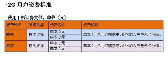 據(jù)了解,中國聯(lián)通手機(jī)閱讀業(yè)務(wù)只針對聯(lián)通網(wǎng)內(nèi)手機(jī)用戶,采用按次點(diǎn)播(按本訂購)的資費(fèi)標(biāo)準(zhǔn)。同時,2G用戶和3G用戶采用不同的支付方式,2G用戶使用手機(jī)話費(fèi)支付,3G用戶使用M/T支付。