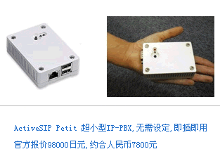 日本C-Borne公司發(fā)布了世界上最小的IP-PBX產(chǎn)品ActiveSIP Petit,采用Asterisk(米國(guó)Digium,Inc.開発),具備昂貴的專有PBX所有功能。這款比手掌還要小的IP-PBX設(shè)備適合小型辦公室和商店使用,可以通過網(wǎng)絡(luò)更新配置和設(shè)置,無需專業(yè)IP人士也可以搭建IP-PBX環(huán)境。利用楽天株式會(huì)社的Fusion通訊服務(wù),將大大降低成本電話費(fèi)和電信設(shè)備投資。