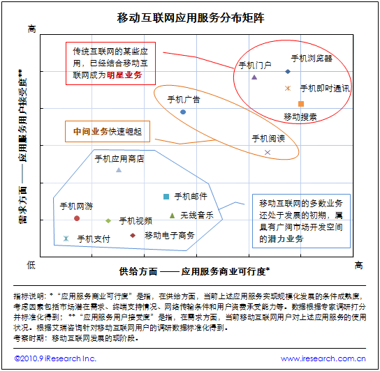 根據(jù)艾瑞咨詢近期發(fā)布的《2009-2010年中國(guó)移動(dòng)互聯(lián)網(wǎng)行業(yè)發(fā)展報(bào)告》,移動(dòng)互聯(lián)網(wǎng)各應(yīng)用服務(wù)在“應(yīng)用服務(wù)商業(yè)可行度”和“應(yīng)用服務(wù)用戶接受度”兩個(gè)維度上被劃分為“明星業(yè)務(wù)”、“中間業(yè)務(wù)”和“潛力業(yè)務(wù)”三個(gè)類型。具備一定規(guī);l(fā)展市場(chǎng)條件,但還面臨若干限制因素的移動(dòng)互聯(lián)網(wǎng)業(yè)務(wù),將在未來(lái)逐步打開(kāi)市場(chǎng)。