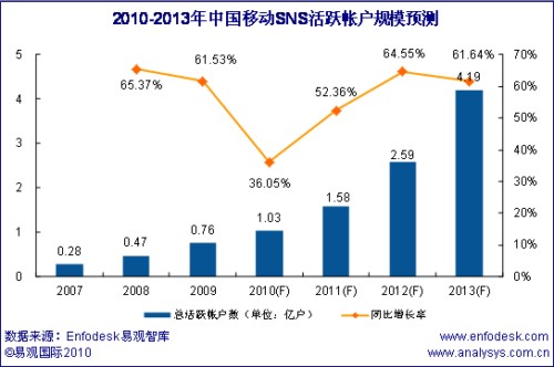 根據(jù)Enfodesk易觀智庫產(chǎn)業(yè)數(shù)據(jù)庫最新發(fā)布的數(shù)據(jù)顯示,到2013年中國移動SNS活躍帳戶規(guī)模將達到4.19億,如下圖所示: