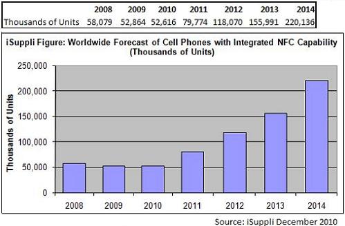 據(jù)市調(diào)機(jī)構(gòu)iSuppli預(yù)估,到2014年,全球內(nèi)建NFC的手機(jī)出貨量可望達(dá)到2.201億部,2010年該數(shù)字為5,260萬部。到了2014年,約有13%的手機(jī)內(nèi)建NFC功能,而2010年該數(shù)字為4.1%。