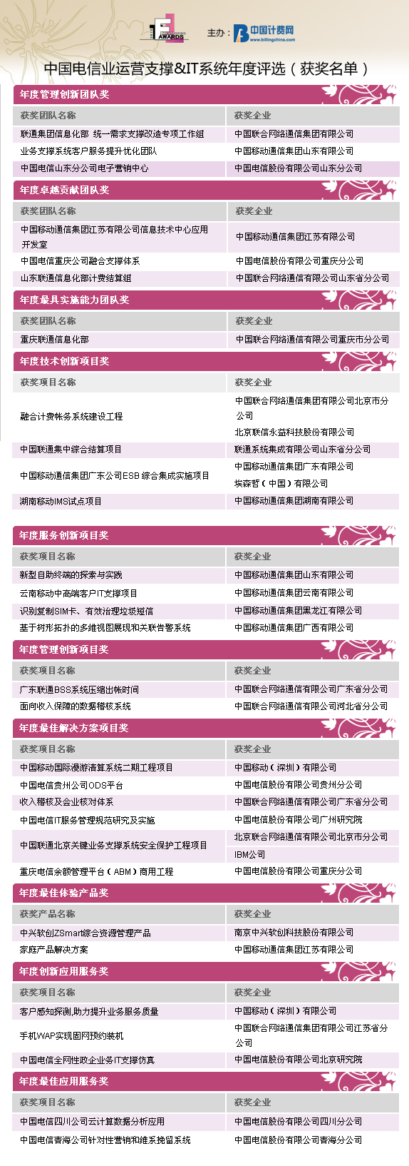 由中國(guó)計(jì)費(fèi)網(wǎng)(www.billingchina.com)主辦的“Awards2010”第四屆中國(guó)電信業(yè)運(yùn)營(yíng)支撐&IT系統(tǒng)年度評(píng)選活動(dòng)的結(jié)果于2011年元月31日隆重揭曉。自2010年12月1日評(píng)選活動(dòng)正式啟動(dòng)以來(lái),歷時(shí)兩個(gè)月,來(lái)自國(guó)內(nèi)運(yùn)營(yíng)商集團(tuán)、省級(jí)公司、IT產(chǎn)品與服務(wù)提供商的42家企業(yè)的優(yōu)秀產(chǎn)品、項(xiàng)目和團(tuán)隊(duì)共計(jì)70份參評(píng)項(xiàng)目入圍評(píng)選。經(jīng)過(guò)全面征集、選拔、初審以及評(píng)委團(tuán)的嚴(yán)格評(píng)審,評(píng)選結(jié)果已經(jīng)公示。在30位來(lái)自運(yùn)營(yíng)商IT支撐、業(yè)務(wù)和服務(wù)部門(mén)的威權(quán)評(píng)委們的認(rèn)真評(píng)審后,共有27家企業(yè)分別獲得了30個(gè)Awards2010的團(tuán)隊(duì)/項(xiàng)目/產(chǎn)品/應(yīng)用服務(wù)的榮譽(yù)桂冠。