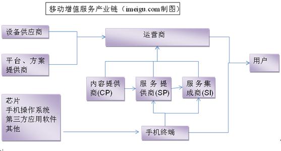 中國電信,中國移動,中國聯(lián)通是中國的三大電信運(yùn)營商。移動增值服務(wù)和移動支付解決方案已構(gòu)成了移動運(yùn)營商的兩大收入來源。移動增值業(yè)務(wù)是包括所有增進(jìn)移動用戶體驗(yàn)的非話音服務(wù),在中國目前主要的四大移動增值業(yè)務(wù)是:短信、彩信、WAP和彩鈴業(yè)務(wù)。移動增值業(yè)務(wù)的產(chǎn)業(yè)鏈如下圖所示: