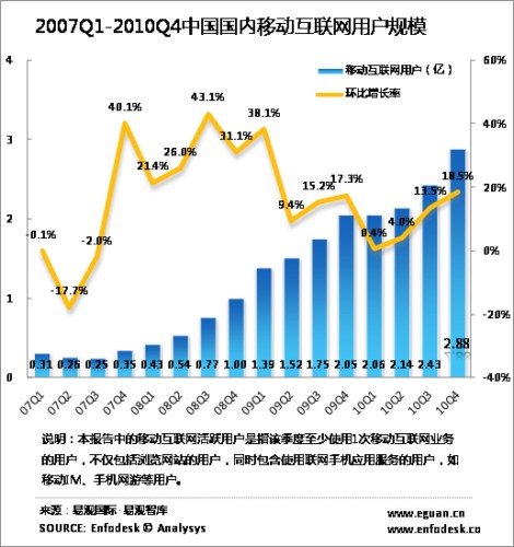 據(jù)Enfodesk易觀(guān)智庫(kù)最新發(fā)布的數(shù)據(jù)顯示,2010年第4季度中國(guó)國(guó)內(nèi)移動(dòng)互聯(lián)網(wǎng)用戶(hù)規(guī)模達(dá)2.88億人,環(huán)比增長(zhǎng)18.52%,相比去年同期呈現(xiàn)41.48%的增長(zhǎng)速度。