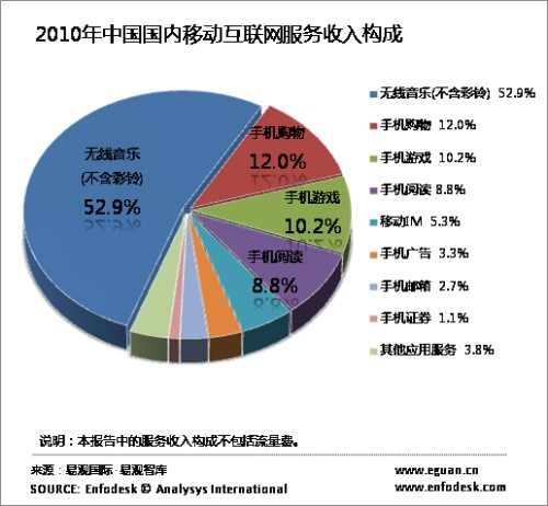 從收入構(gòu)成看來(lái),無(wú)線(xiàn)音樂(lè)、手機(jī)游戲、手機(jī)閱讀逐漸成為三大主要移動(dòng)互聯(lián)網(wǎng)娛樂(lè)應(yīng)用,手機(jī)購(gòu)物增速明顯。