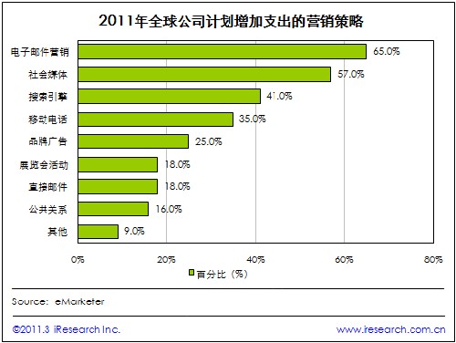 iResearch艾瑞咨詢根據(jù)eMarketer發(fā)布的調(diào)查研究報(bào)告發(fā)現(xiàn),2011年,全球65%的公司將在電子郵件營(yíng)銷中增加支出,57%的公司愿意在社會(huì)媒體營(yíng)銷中增加開(kāi)支;而愿意在其他營(yíng)銷策略增加支出的公司均未超過(guò)五成。