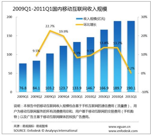 2011年第1季度國(guó)內(nèi)移動(dòng)互聯(lián)網(wǎng)收入達(dá)190億元