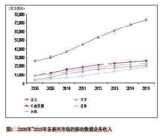 就絕對(duì)值來看亞太地區(qū)的新興市場(chǎng)將占主導(dǎo)地位,該地區(qū)的移動(dòng)數(shù)據(jù)業(yè)務(wù)收入將從2010年的368億美元增長(zhǎng)到2015年的734億美元,增長(zhǎng)率幾乎為100%。給出這么高的預(yù)測(cè)值不足為奇,因?yàn)樵撌袌?chǎng)上有中國(guó)、印度、印尼“三大巨頭”,這三個(gè)國(guó)家對(duì)該區(qū)域數(shù)據(jù)業(yè)務(wù)收入的貢獻(xiàn)將達(dá)到81%。